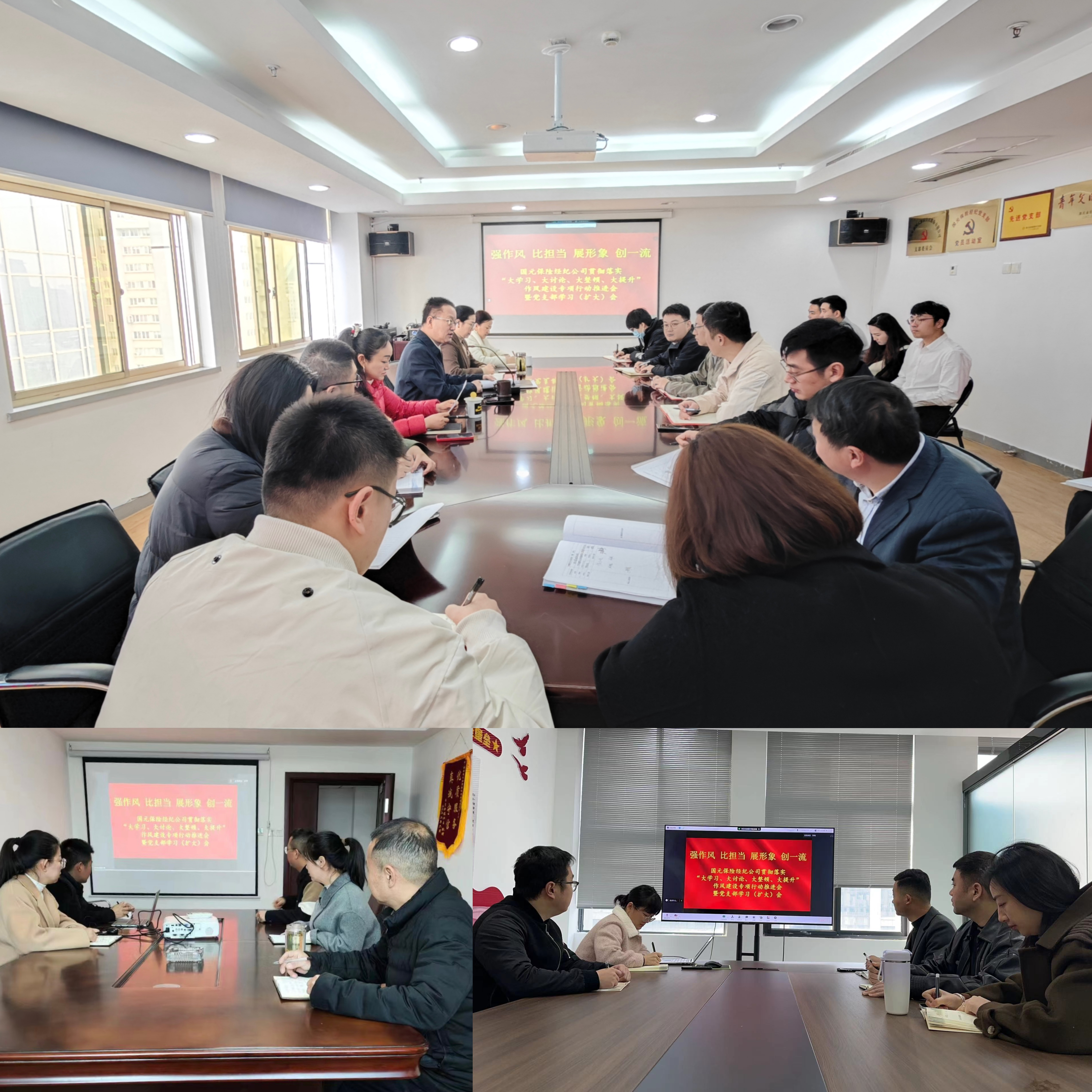 支部書記、董事長陳紅兵做重要講話并做工作部署。公司成立了作風(fēng)建設(shè)專項行動工作專班,明確了工作職責(zé),制定了《國元保險經(jīng)紀(jì)公司“大學(xué)習(xí)、大討論、大整頓、大提升”作風(fēng)建設(shè)專項行動實施計劃》。